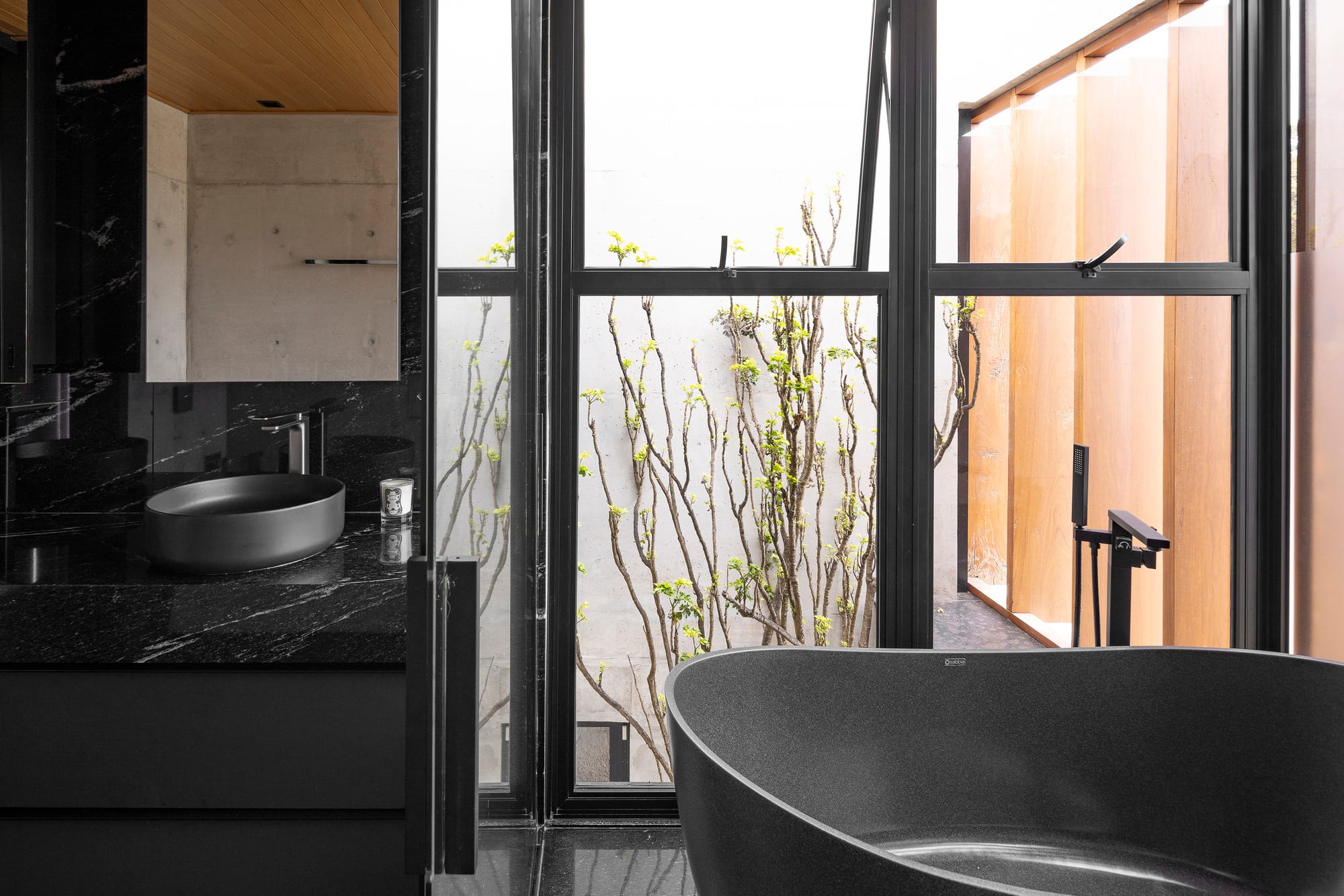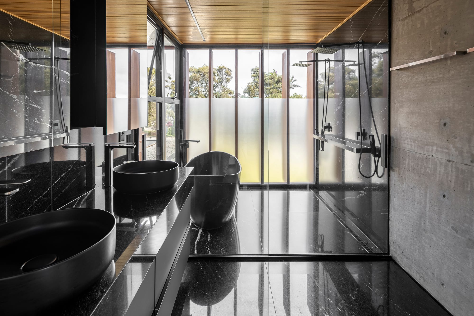 Exposed concrete was the central element of the materiality, chosen for its plastic expressiveness and durability against the region's red earth. It is complemented by stonework, flame-finished black granite, and cement-like porcelain tiles, creating an austere and elegant palette.