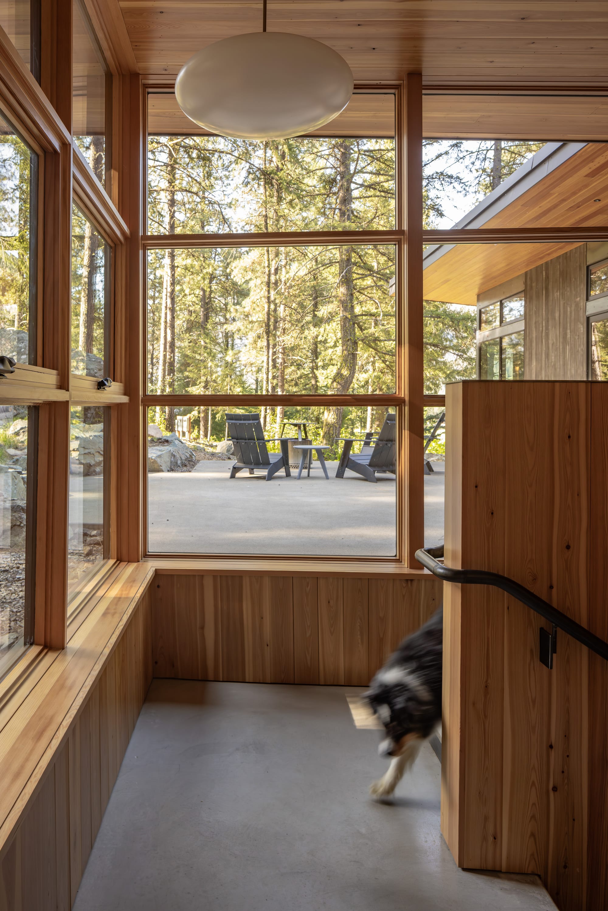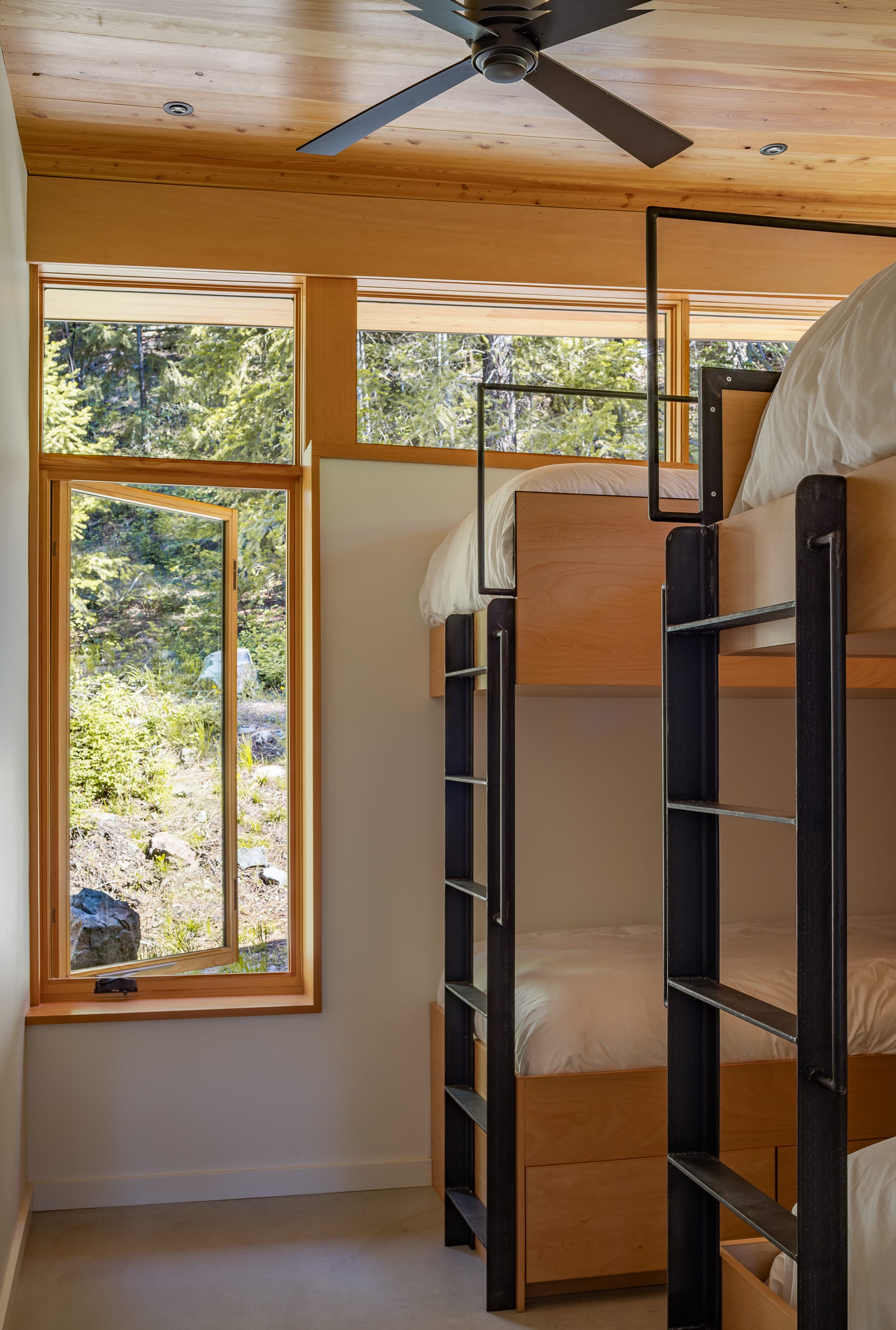 The palette of materials is subdued, but warm and natural. Concrete, untreated steel, Douglas fir trim and surfaces, and simple white walls play background to the forest views and soft greens of tile, light fixtures, and furnishings.
