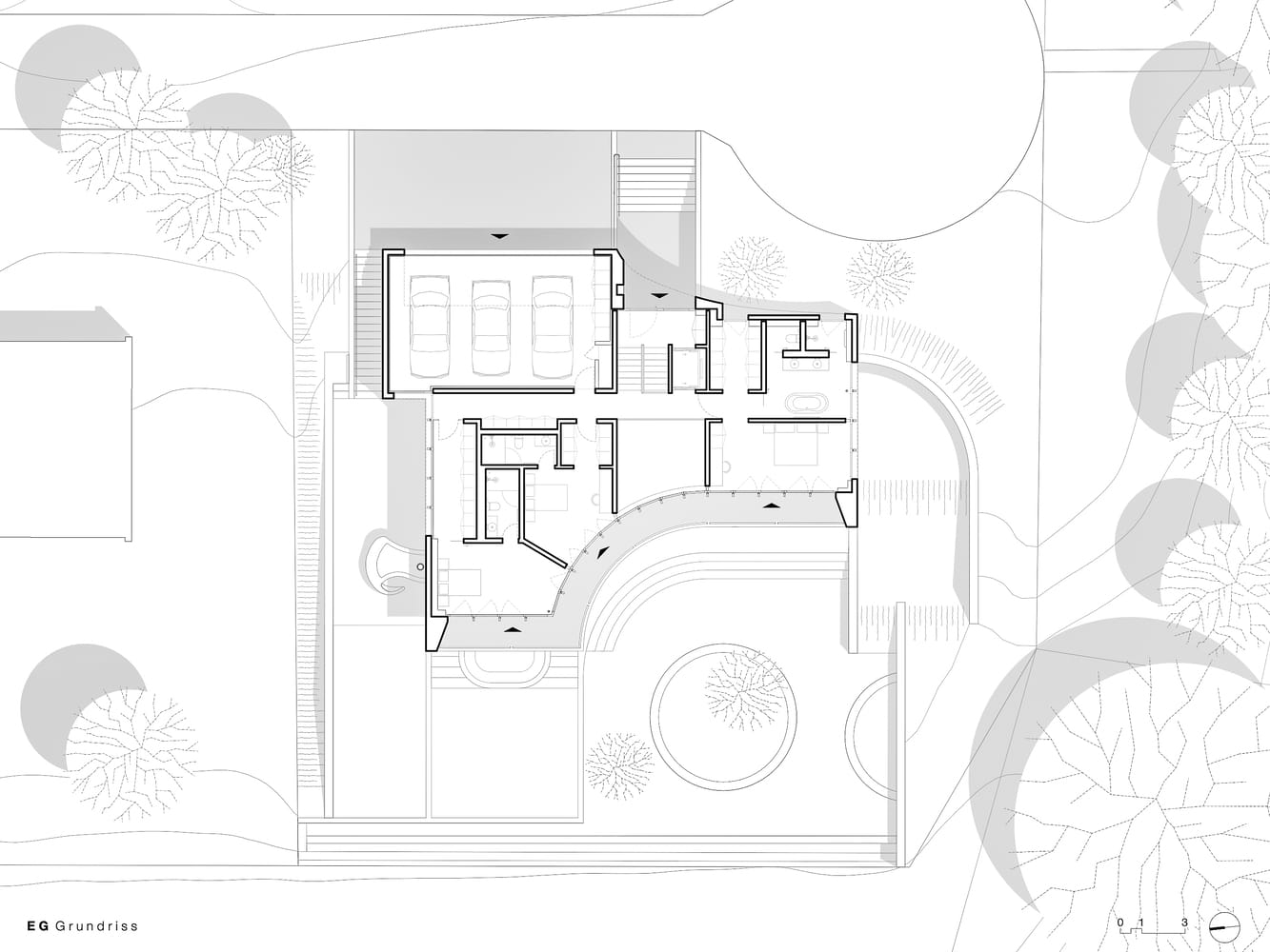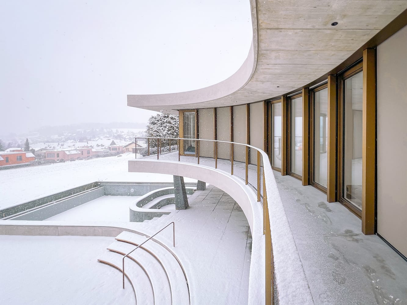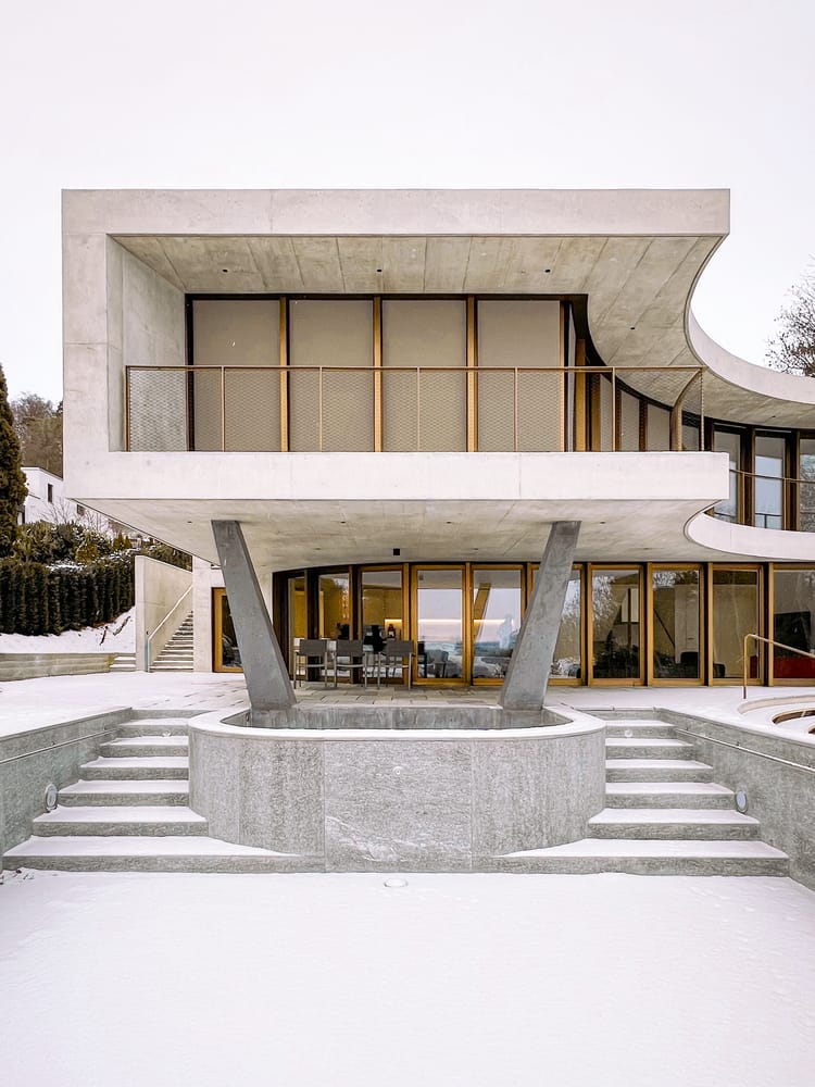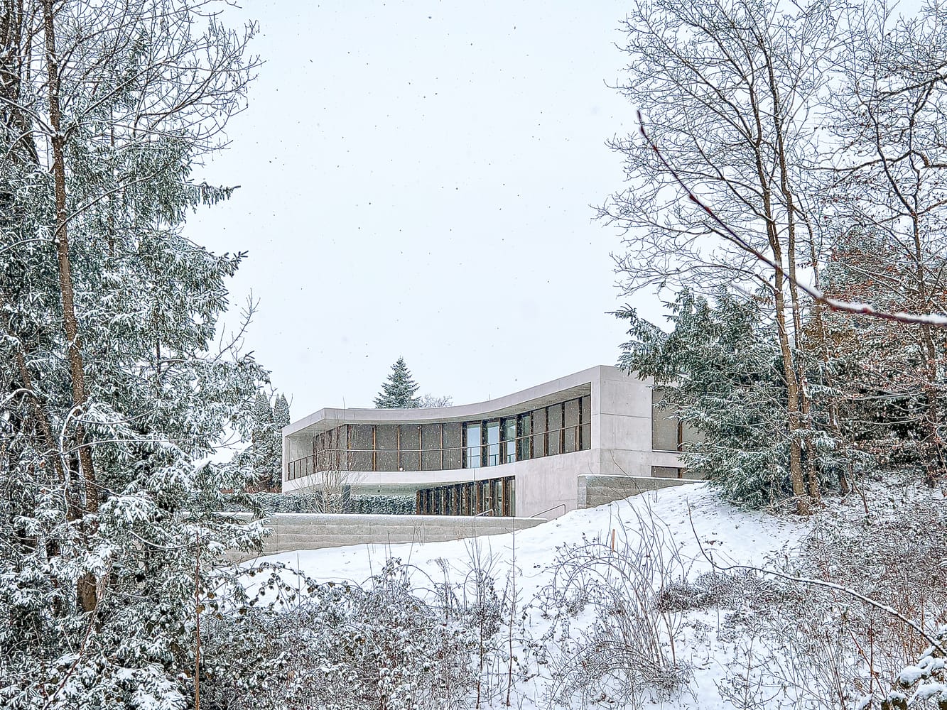 Its curved design orients all interior spaces toward the setting, allowing the inhabitants to experience both the architecture and its context through all four seasons. The landscape concept integrates the building into the natural terrain, creating the impression that it has always belonged to this very place. The exterior material palette reinforces this dialogue: textured bronze windows allow light to shift in color—a homage to the autumnal tones of the forest—while natural, hand-worked stone slabs reference local Roman ruins, acknowledging the region's historical layers.