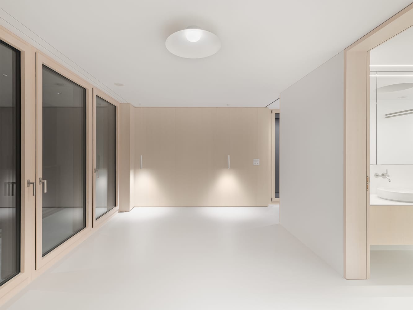 In contrast to the raw exterior materials, the interiors are intentionally restrained: seamless white floors, white-washed natural wood surfaces, and white plastered walls and ceilings. This composition, filled with abundant daylight, generates a peaceful atmosphere and directs focus toward the astonishing views of the valley and nearby forest.