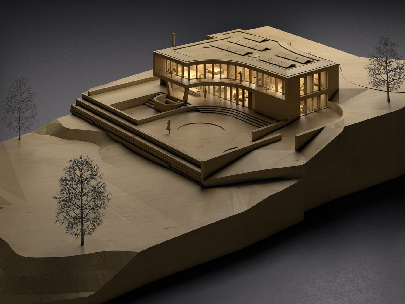 Through the seamless integration of geothermal and solar systems, Winkelhaus is fully powered by nature, achieving energy autonomy using its own ecosystem. By nesting the structure into the ground, the earth's mass naturally regulates interior temperatures year-round. As a smart home, the building uses advanced technology to optimize energy consumption and enhance comfort.